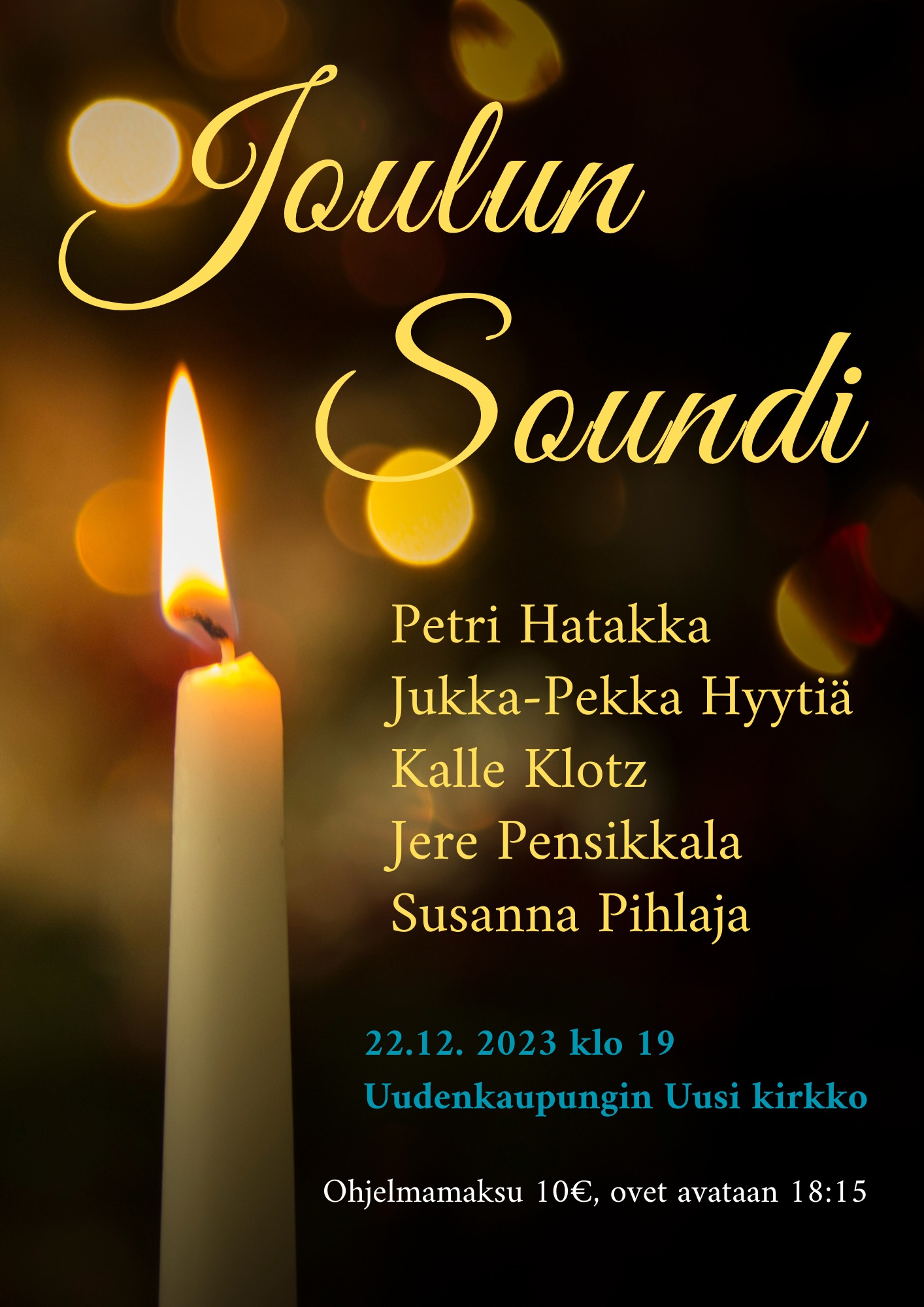 Upeaäänistä Antti Ahopeltoa kuullaan joulukonsertissa tunnelmallisessa Kalannin kirkossa ti 19.12. klo 19. Jo perinteeksi muodostunutta, paikallisten musiikoiden Joulun Soundi -konsertti virittää joulun tunnelmaan Uudessa kirkossa pe 22.12. klo 19.