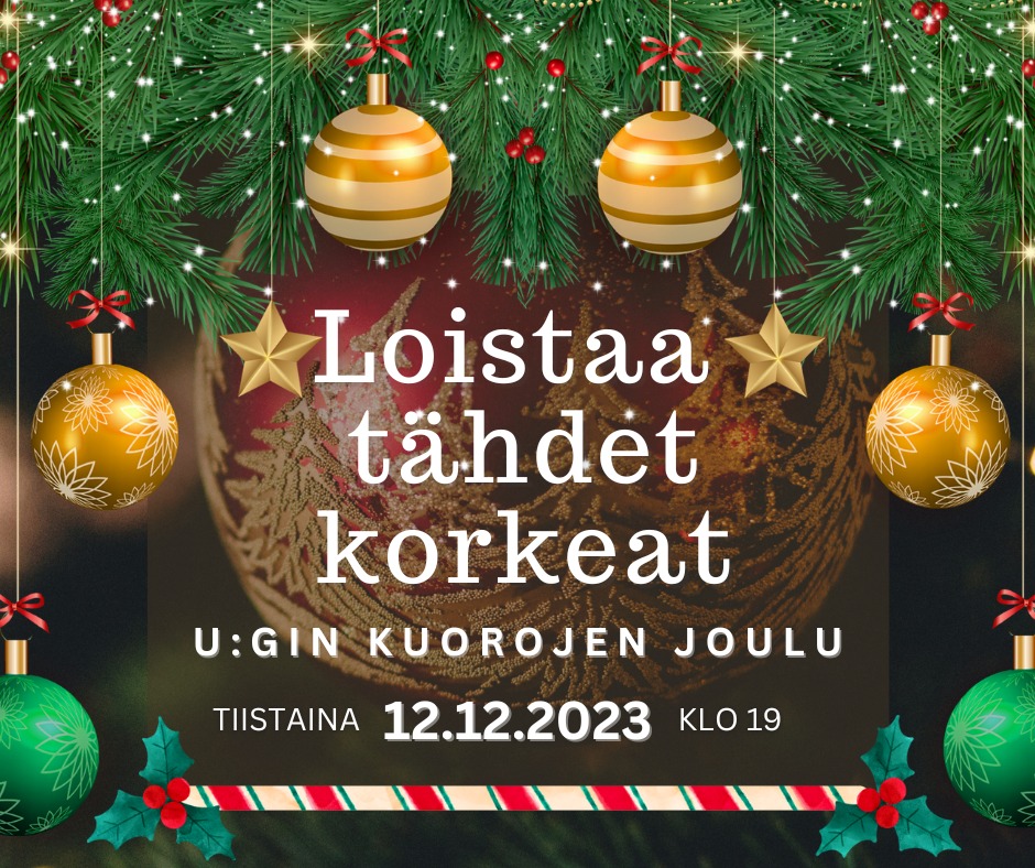Kauneimpia joululauluja pääsee totuttuun tapaan laulamaan monissa Uudenkaupungin alueen kirkoissa. Tarjolla on myös musikaali ja joulukonsertteja. Loistaa tähdet korkeat - Ugin kuorojen joulu -konsertti on ti 12.12. Uudessa kirkossa klo 19. Tunnelmaa ovat luomassa viisi eri kuoroa.