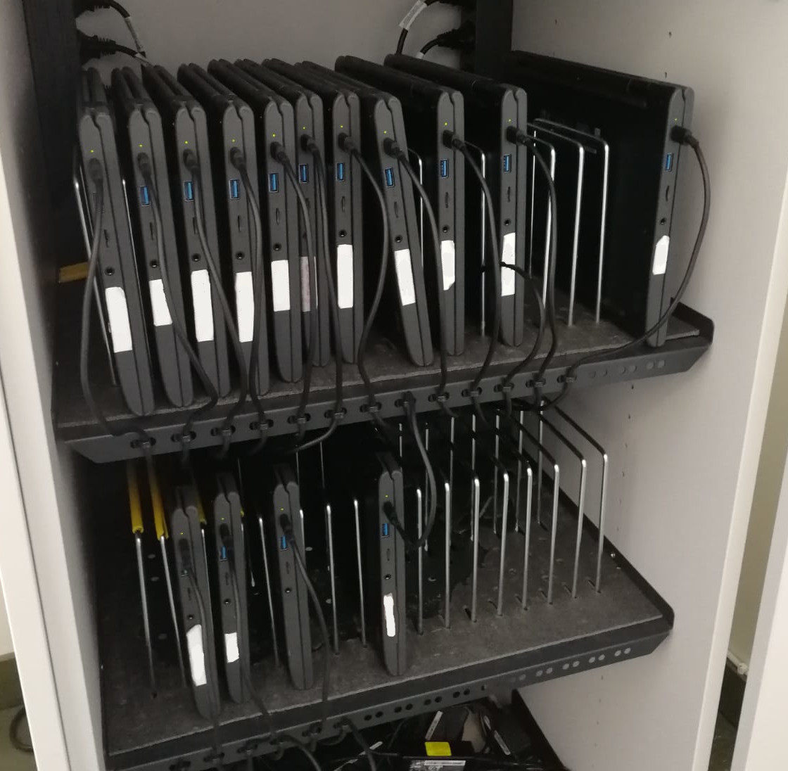Chromebook-tietokoneita latausvaunussa käyttäjiä odottamassa.