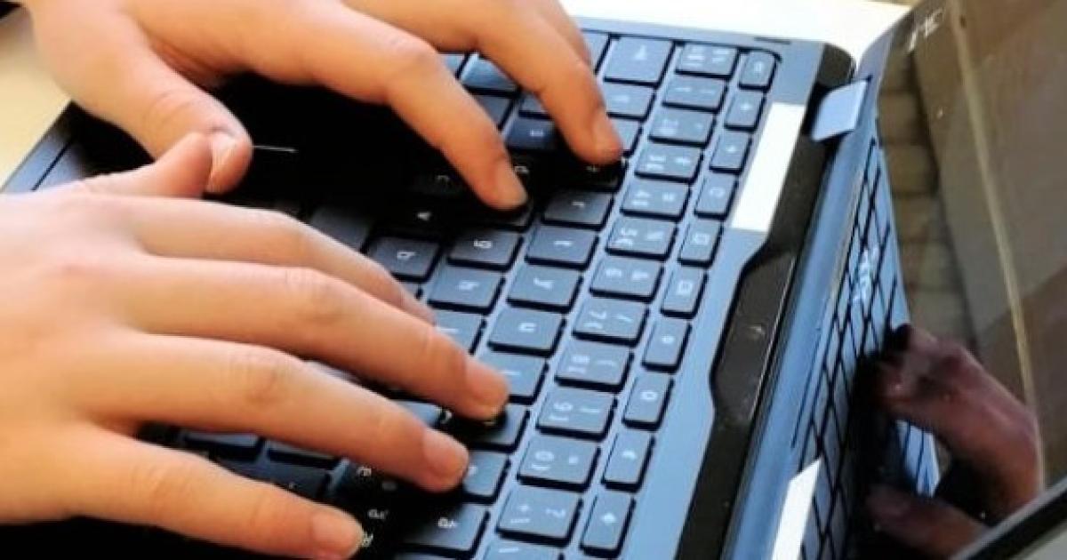 Oppilaan kädet tietokoneen näppäimistöllä.