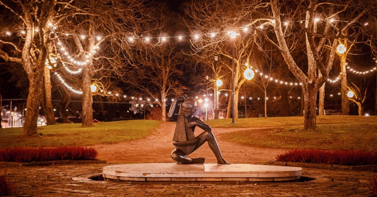 Rauhanpuisto iltavalaistuksessa, keskellä Toivo-patsas