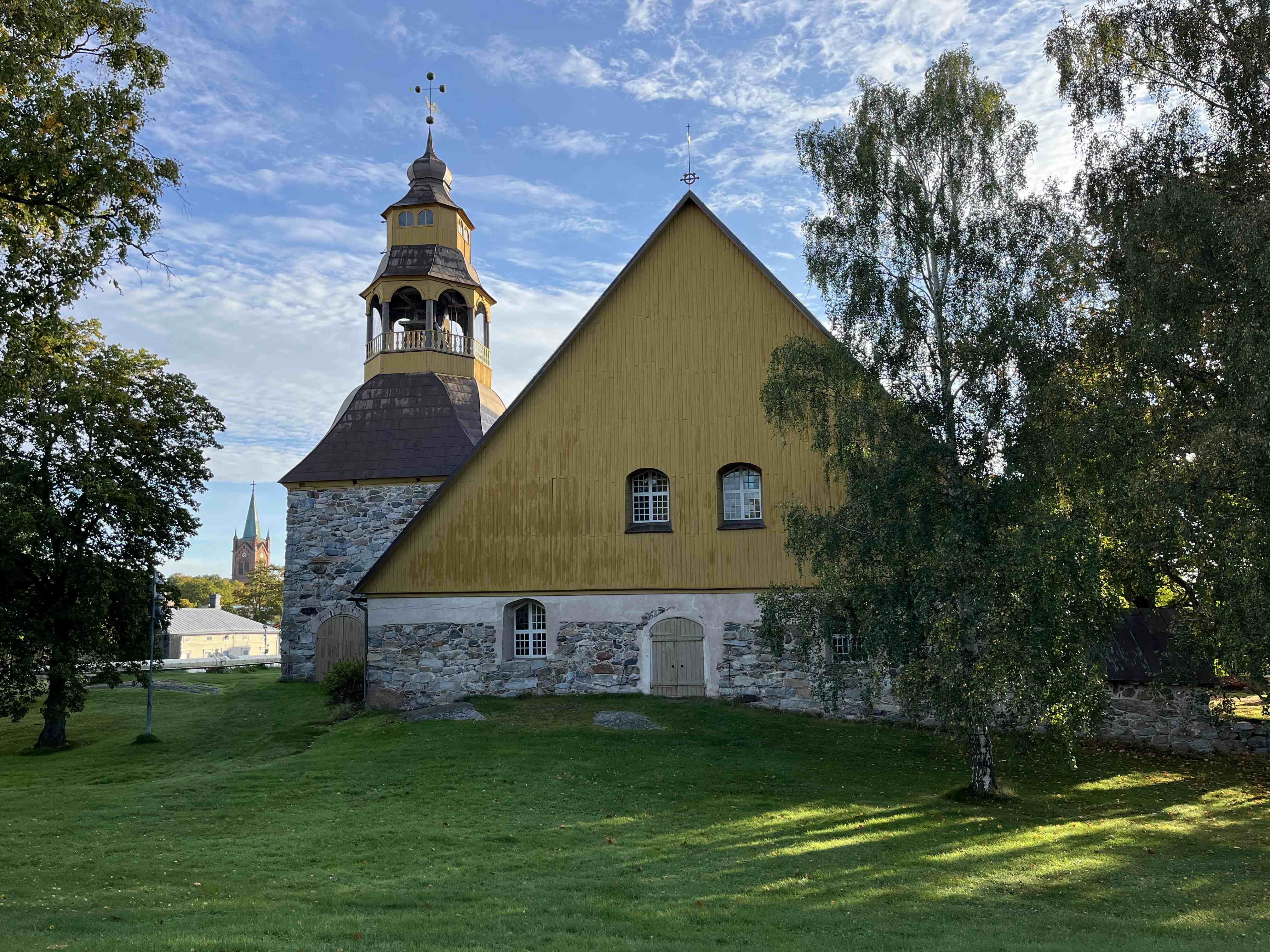 Alinenkatu 44, Uusikaupunki. Holvikattoinen harmaakivikirkko vuodelta 1629 on keskusta-alueen vanhin rakennus. Vanha hautausmaa ja sankarihaudat.