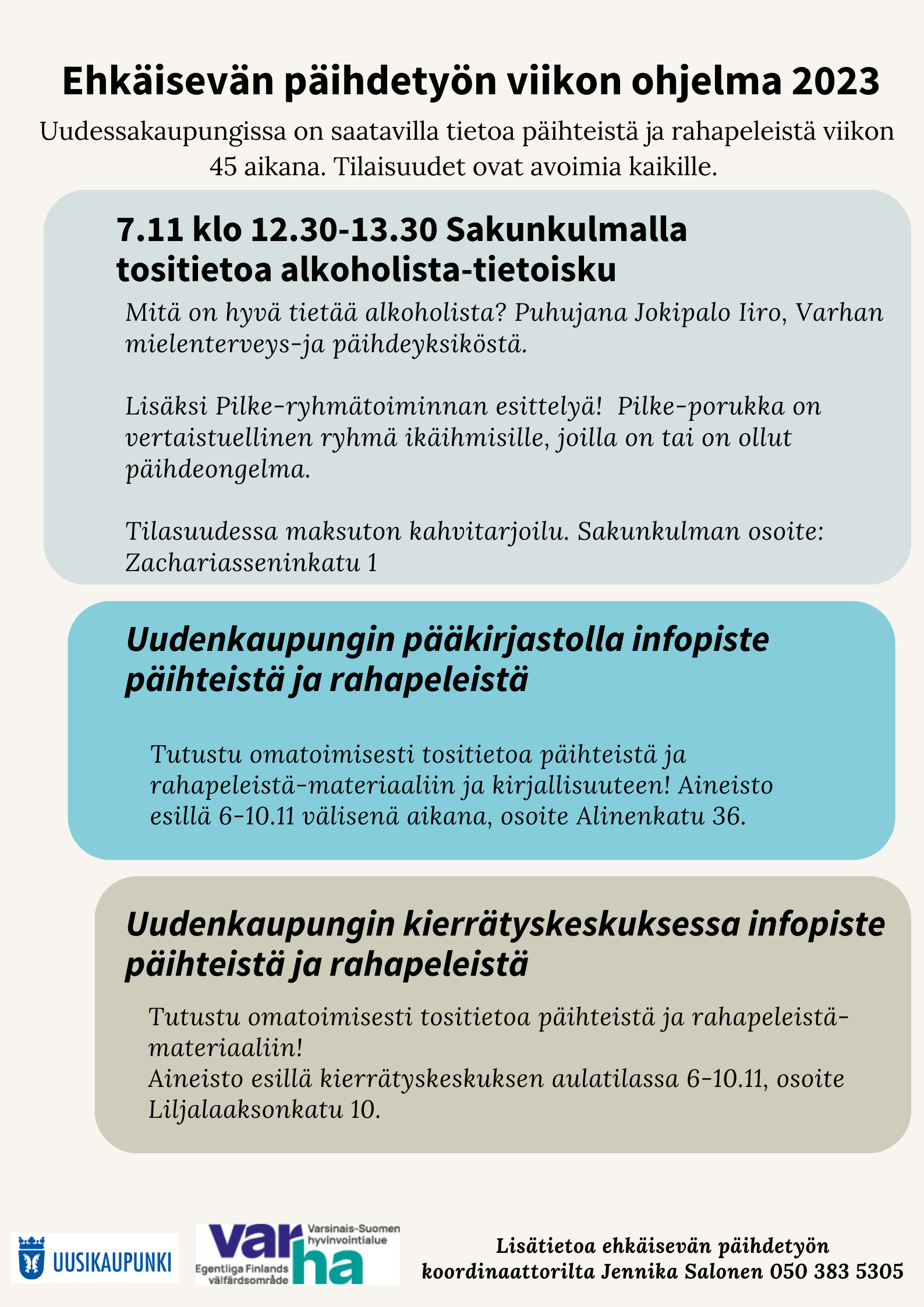 Uudessakaupungissa on saatavilla tietoa päihteistä ja rahapeleistä viikon 45 aikana. Tilaisuudet ovat avoimia kaikille ja ne järjestetään valtakunnallisen ehkäisevän päihdetyön viikolla.