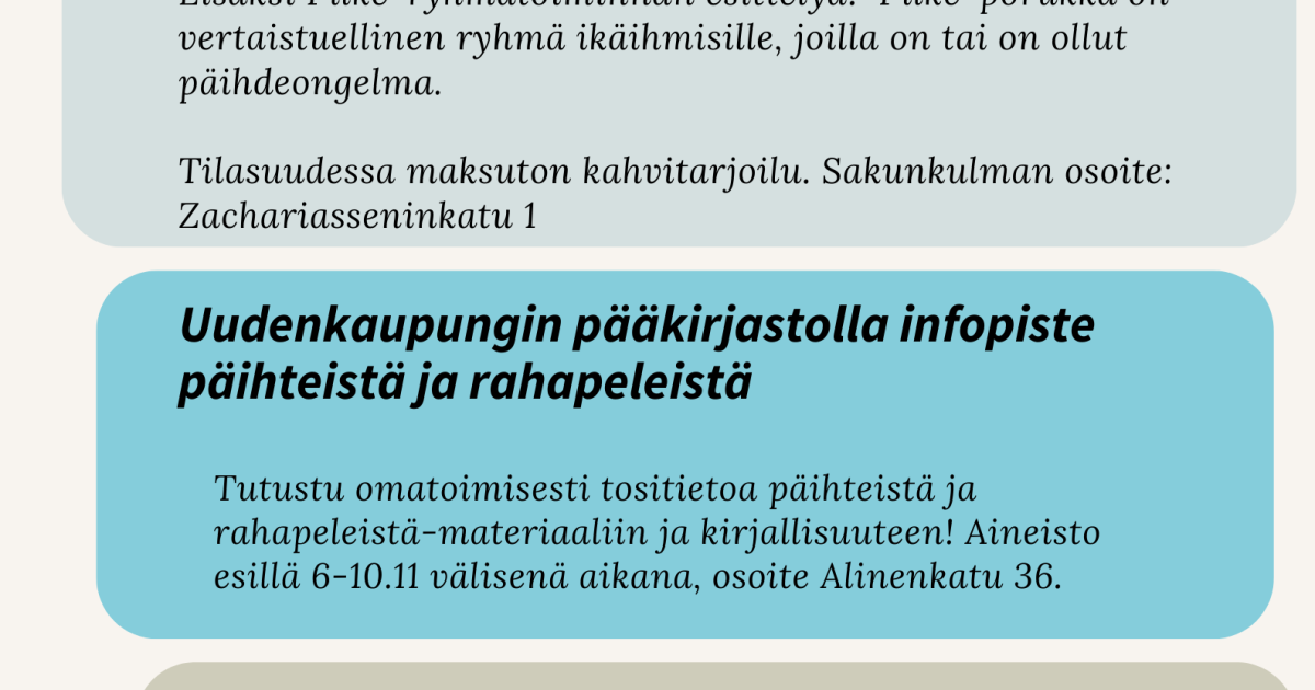 Uudenkaupungin pääkirjastolla infopiste päihteistä ja rahapeleistä