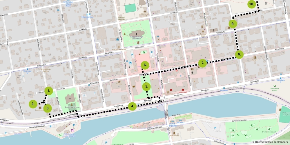 Uudenkaupungin keskustan maisemakävelyn reitti numeroituna