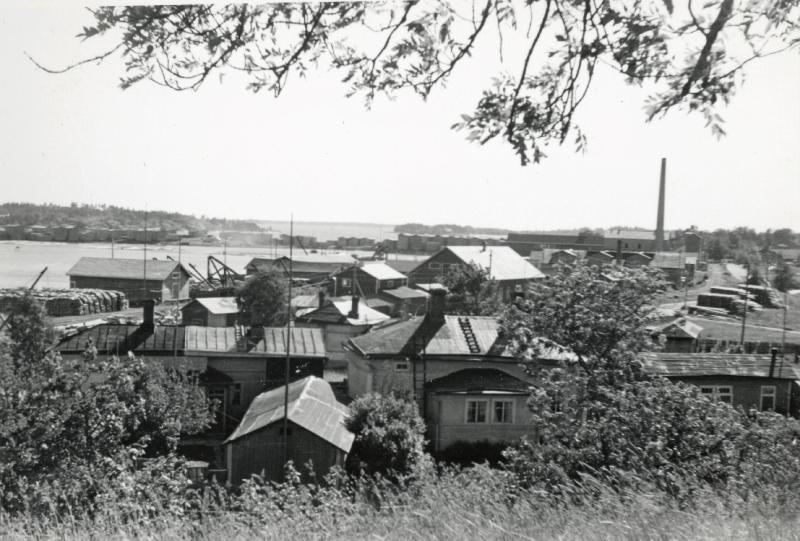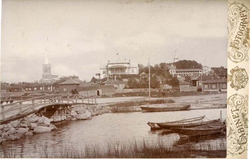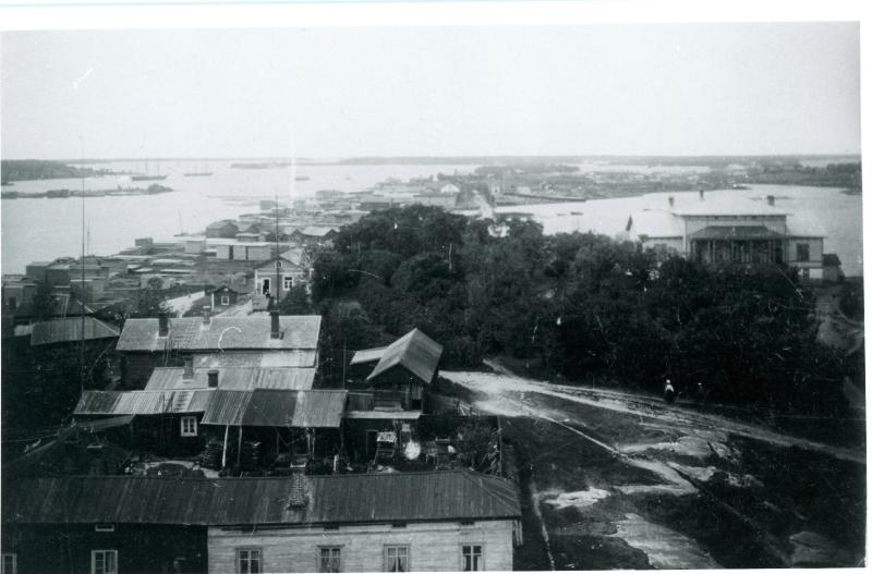 sisällön kuvaus: Valokuvapostikortti. Yleisnäkymä kaupungista, Myllymäen vesitornista kuvattuna. Etualalla Myllykatu, oikealla Vuorikatu, vasemmalla Ylinenkatu ja museo. Taustalla uusi ja vanha kirkko. Kaupunkikuva
