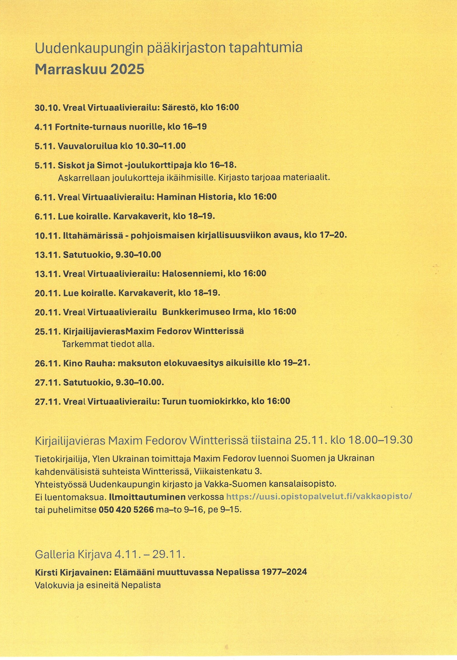 Näin tilaat tapahtumatiedotteen sähköpostiisi: lähetä pyyntö otsikolla "Tilaan kirjaston tapahtumatiedotteen" osoitteella lauri.seutu@uusikaupunki.fi.