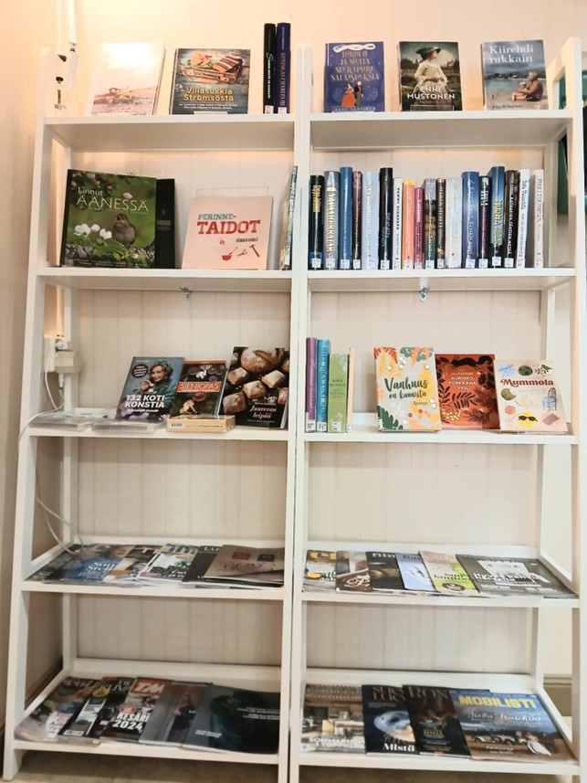 Tarjolla on kirjallisuutta laidasta laitaan, romanttisesta viihteestä jännitykseen ja historiallisiin romaaneihin, runoihin, elämäkertoihin ja tietokirjoihin. Lehtivalikoimassa on eri alojen kulttuuri- ja tiedelehtiä, tekniikka-, käsityö- ja sisustuslehtiä sekä terveys- ja hyvinvointilehtiä. Myös äänikirjoja on tarjolla CD-levyinä.